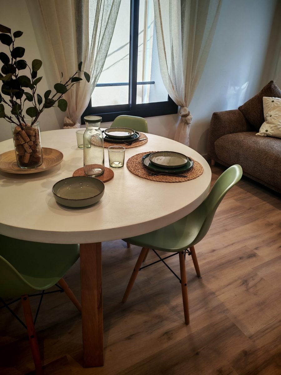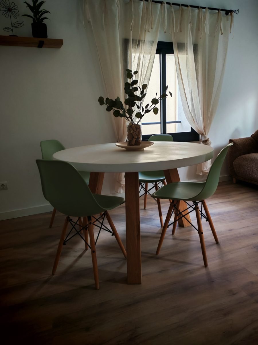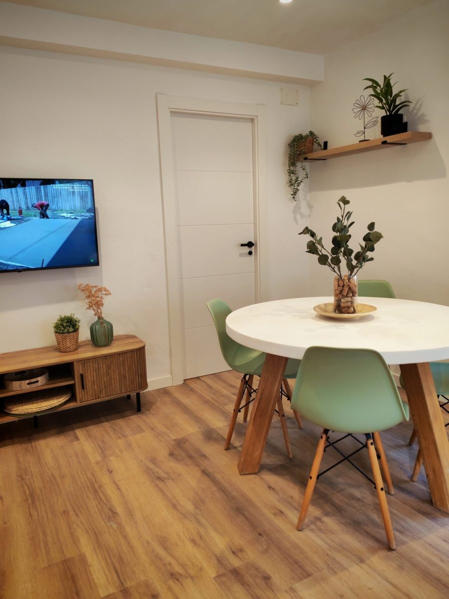 El menjador disposa d’una taula per a 6 persones, sofà i televisió plana. És un espai obert on també trobareu una cuina completa amb forn, placa d’inducció, microones, nevera, cafetera i escalfador d’aigua, a més de tots els estris necessaris per sentir-te com a casa. En una zona vinícola com la Conca de Barberà, no poden faltar copes de vi i cava.
